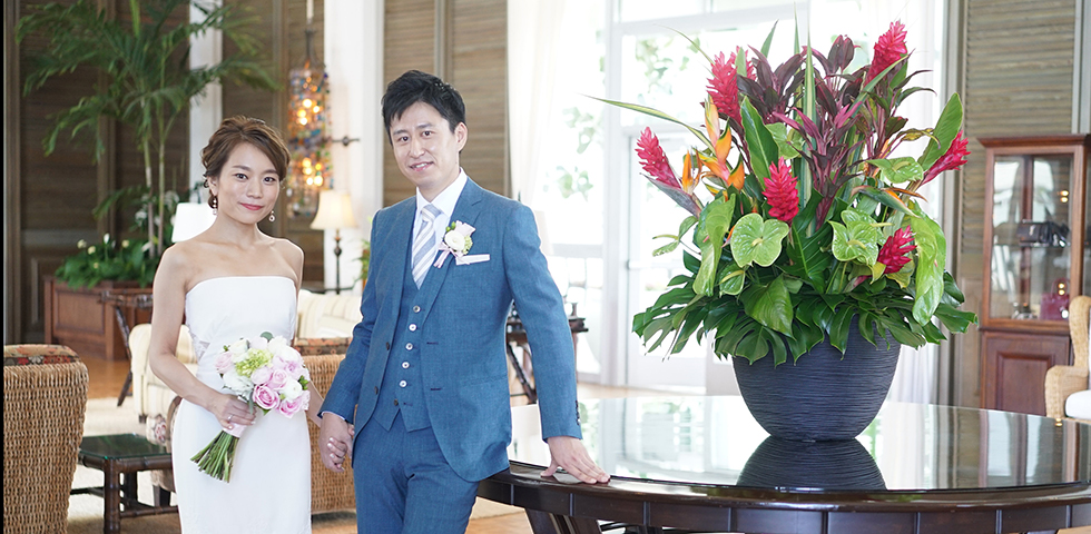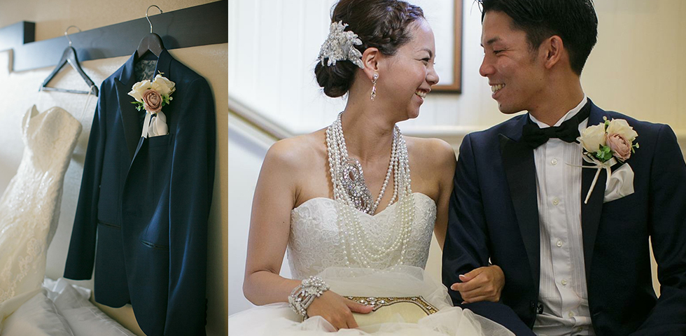「もともとHarry Style さんでスーツを作っていただいていて、挙式でも絶対オーダーでと決めていたので、おすすめのネイビーのタキシードを作っていただきました。彼女も打ち合わせに立ち会ってくれて盛り上がりました。やはりHarryさんの服はシルエットがよその物と全然違って、周りに褒められます。先日は早速紺のジャケットを友人の海外挙式に着て行きました。」(30代前半男性)