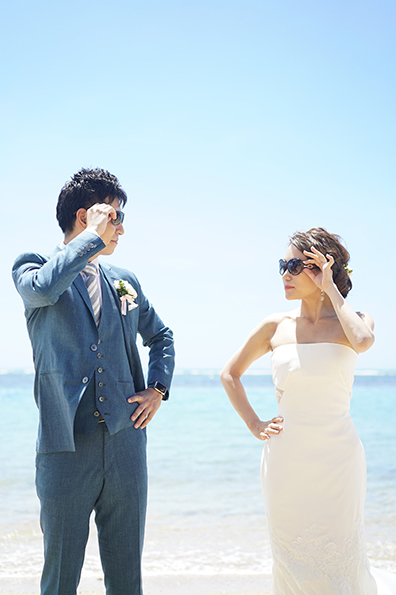 例えばパンツをデニムに替えてビーチサンダルでガーデンパーティ(披露宴)へ。ネイビーなら、開放的なリゾートにも自然に囲まれた空間にも違和感なく溶け込む、スタイリッシュなスタイルが完成。