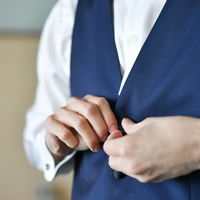 「紺のタキシードのレンタル屋を2、3軒回って試着したんですが、新婦のドレスはいっぱいあるのに、新郎の衣装は結構種類が少なかったし、自分の体型のせいもあり着てみるとどれもガバガバでした。仕方なく(すみません)オーダーしたのですがやはり見た目も着心地も全く別物でびっくりしました。完成までの時間もすごく楽しみで、オーダーして良かったと思っています。」(20代後半男性)